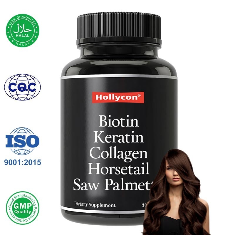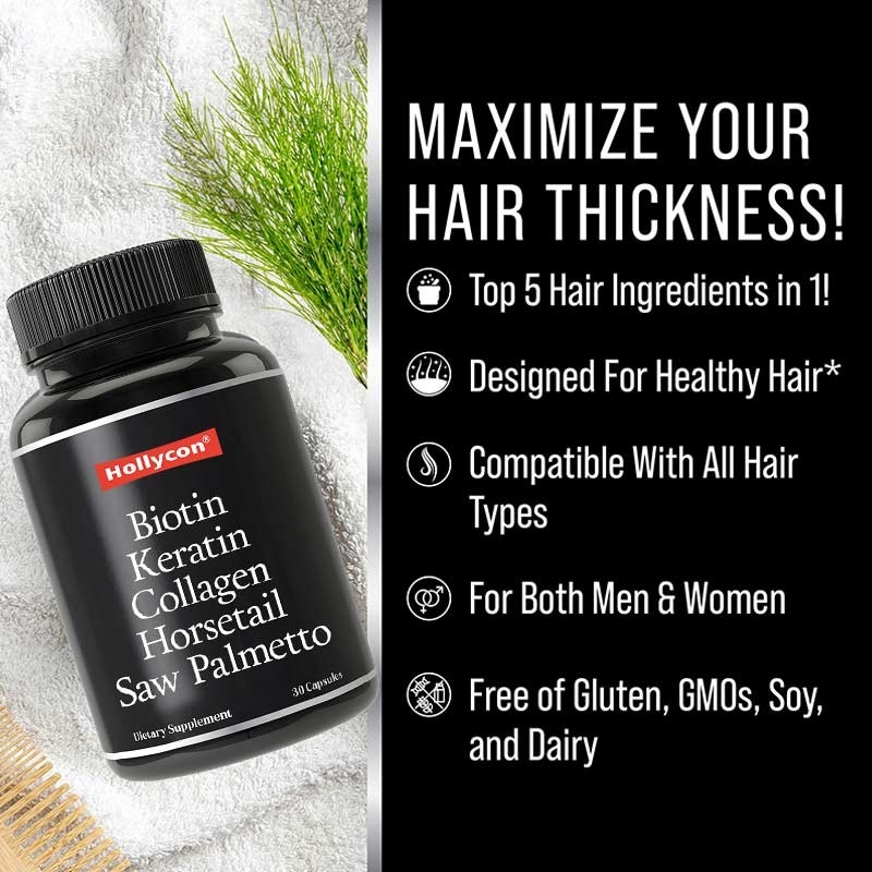 바이오틴, 케라틴, 콜라겐, 호스테일, 그리고 파밀메토의 강력한 조합으로 머리카락의 성장을 촉진합니다.