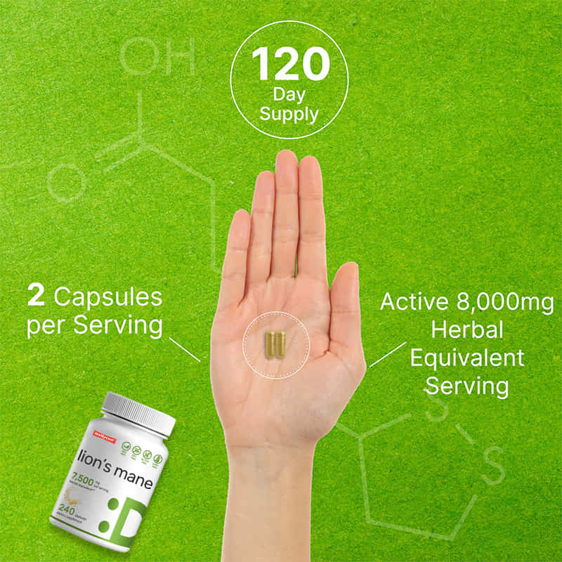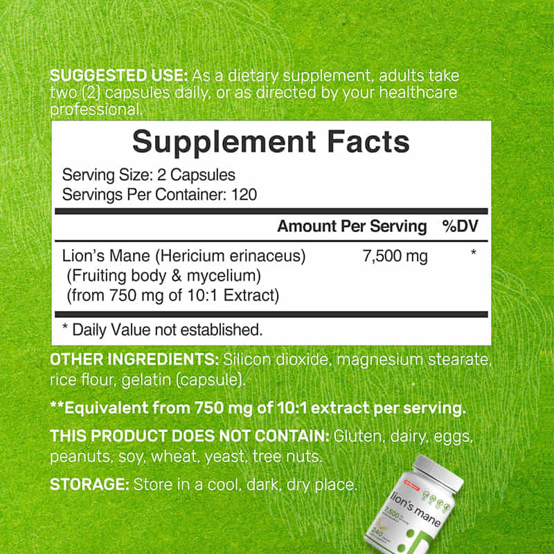 Lion' s Mane 캡슐은 과일 몸과 미세리움의 강력한 10: 1 추출물으로 구성되어 있으며, 1회당 7, 500 mg의 고강도 복용량을 제공합니다.신생 수확된 Hericium erinaceus 버섯으로 만들어집니다., 이 캡슐들은 자연적으로 발생하는 노트로픽제, 항산화제, 폴리사카라이드를 보존하여 뇌 건강, 면역 기능, 전반적인 활력을 지원합니다.
