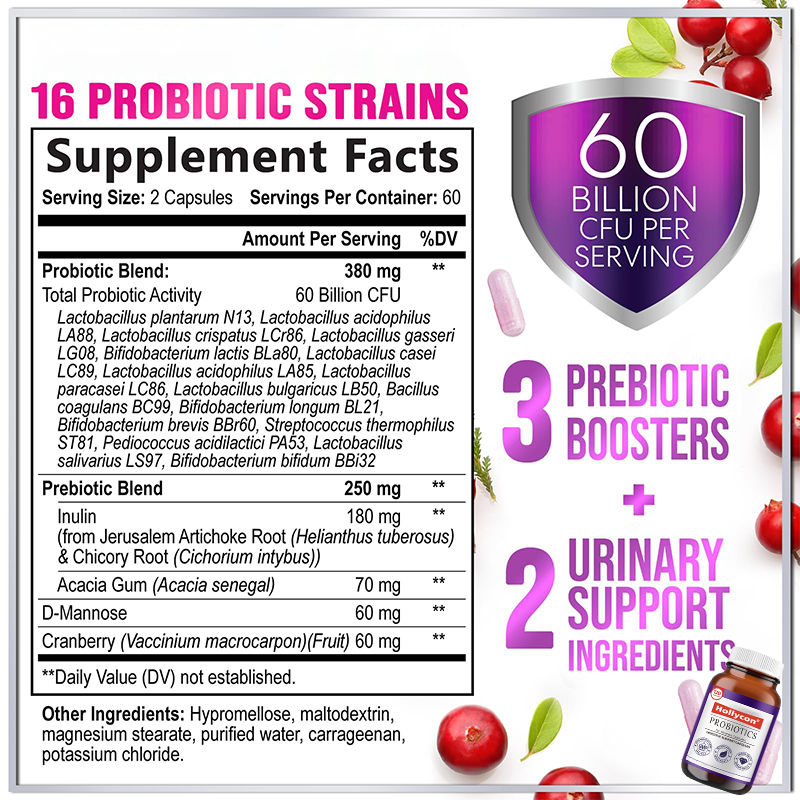 프리미엄 여성용 프로바이오틱스 포뮬러: 당사의 여성용 프로바이오틱스는 효율성을 극대화하기 위해 프리바이오틱스와 크랜베리로 강화되었습니다. 이 여성용 프로바이오틱스는 비뇨기 건강, 질내 플로라 및 pH 균형을 지원하는 데 도움이 됩니다.